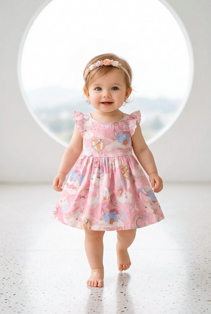 This dreamy dress features a whimsical print of unicorns, castles, rainbows, and hot air balloons—perfect for little girls who love all things magical. Designed with a soft, breathable fabric and a comfortable sleeveless cut, it’s ideal for warm days, birthdays, playdates, or special outings.